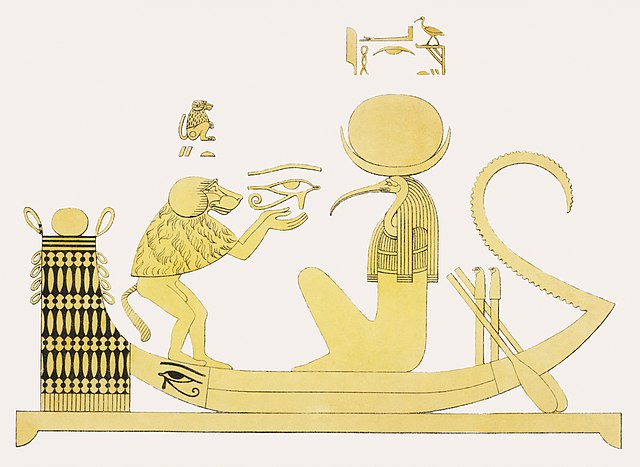 Der Pavian erscheint vor allem in zwei Gestalten in der ägyptischen Mythologie: Einmal als Babi, einem Gott, der vor allem für die sexuelle Potenz im Jenseits verantwortlich ist (auch dazu s. u.). Andererseits kann Thot, der Gott der Schrift und der Schreiber, des Mondes und des Maßes, als Mantelpavian in Erscheinung treten und eben auf Thot wird in den folgenden Versen deutlich alludiert: Aus abrahamitischer Perspektive ist der heidnische Thot ein „Götzenbild“ (V. 2; auf die Parallelen zu Kolmars Gedicht „Das Götzenbild“ kann hier nur hingewiesen werden). Er ist der Mondgott („Gezeiten“, V.3; „Mond“, „kleiner bleicher Mohrenschild“, V. 4; „gebuckelt runden Lichte“, V. 5; „strahlleicht“, V. 6; „Scheibe“, V. 7, „silberblau“, V. 9) und damit Gott des Maßes („maß“, V. 4; „schminken“, V. 9; zu diesem Aspekt s. u.) – „Mond“ ist verwandt mit „messen“ und bedeutet insofern etwa „Zeitmesser“. Durch diesen Aspekt ist er gleichzeitig verbunden mit den Toten: Er misst die Zeit („Gezeiten“, V. 3) der Menschen und hilft seiner Gattin Maat beim Totengericht, das Herz des Verstorbenen auf der Waage („Waage“, „wägte“, V. 3) der Gerechtigkeit zu wiegen und führt darüber Protokoll: Er ist nämlich vor allem Gott der Schreiber.