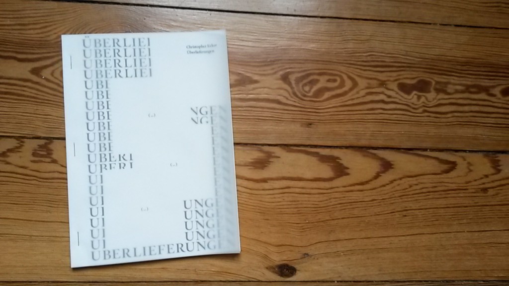 Das Wort „Überlieferung“ kann sich, so lernt man nach einer kurzen Wikikonsultierung (oder einer Konsultierung des eigenen Verstandes, wenn man noch nicht so hirnfaul wie unterzeichneter Millenial ist), auf zwei Dinge beziehen: In den meisten Fällen bezieht es sich auf Inhalte, die überliefert werden, Wissen, Bräuche, Regeln etc. In selteneren Fällen kann es aber auch den Akt der Weitergabe dieser Inhalte selbst meinen und genau diesen Akt und dessen scheinbaren Sekundärcharakter betont Christopher Eckers im Dezember 2020 erschienener Band Überlieferungen.