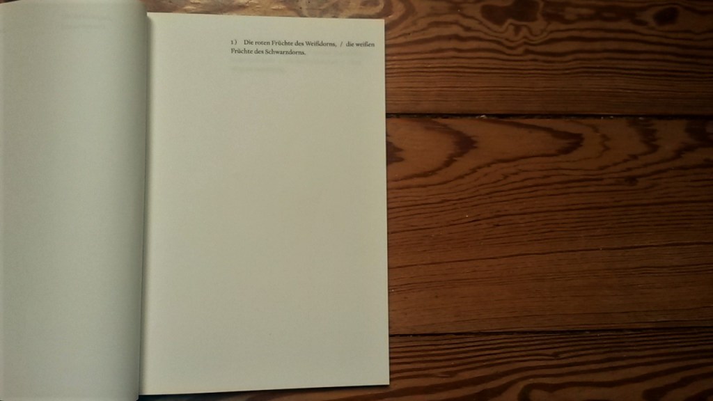 Auf diese Weise wird schon rein grafisch die Bedeutung der Leere als Bedingung der Schrift deutlich: Ohne Kontext kein Text, ohne Unterliegendes kein Hervorgehobenes, ohne (materiellen) Überlieferer kein Überliefertes. Der bewusst kalkulierte Leerraum der hochwertigen Seiten oder Details wie das milchige Deckblatt (s. erstes Foto), das eine bereits „verdorbene“ Titelseite mit abgebrochenen Titelzügen darunter trübt, unterstützen den Fokus auf die Fragwürdigkeit von Inhalten und die Medialität der „Überlieferungen“, in diesem Fall also: das Medium Buch. Was man auch über den Inhalt denken mag: Es ist ein wunderschönes kleines Gesamtkunstwerk, das Ecker und der Indieverlag stirnholz hier geschaffen haben.